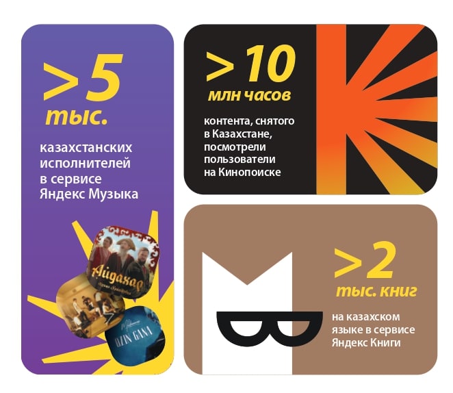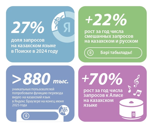Кроме того, мы активно работаем над популяризацией казахского языка и культуры в цифровом пространстве: уже 27% запросов в «Поиске» поступают на казахском языке, функция автоматического перевода видео на казахский в «Яндекс Браузере» пользуется популярностью у 880 тыс. пользователей, а благодаря проекту ISKRA Qazaqstan в «Яндекс Музыке» казахстанские музыканты увеличивают свою аудиторию в сотни раз.
