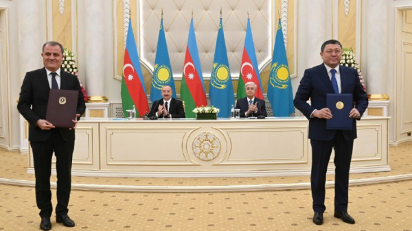 – С удовлетворением отмечаю совместную работу по транспортировке казахстанской нефти по маршруту Баку – Тбилиси – Джейхан. В прошлом году транзит этого стратегического сырья через Азербайджан составил почти полтора миллиона тонн. В ближайших планах – значительно увеличить этот объём. Импульс развитию национальных энергосистем призван придать проект прокладки глубоководного электрического кабеля, который существенно усилит наши позиции в экспорте "зеленой" энергии. Большая работа проводится в рамках поставок казахстанской урановой продукции на зарубежные рынки через территорию Азербайджана. И в этой связи хочу выразить признательность уважаемому президенту Азербайджана за поддержку всех ключевых инициатив и проектов, – подчеркнул президент Казахстана.