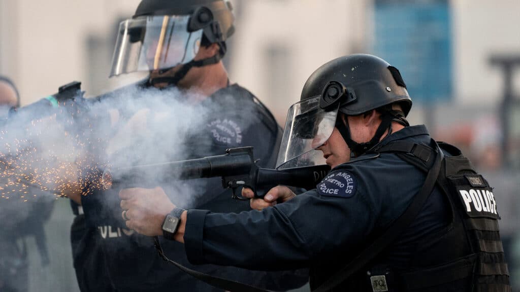 Полиция Лос-Анджелеса назвали митинги «незаконными собраниями», так как протестующие бросали бетон, бутылки и другие предметы в полицейских. В центре города подожгли несколько беспилотных автомобилей, начались аресты. Полиция задействовала конных офицеров, чтобы пытались контролировать толпу.