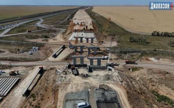 На хромтауской трассе будет два моста через речку Сарымырза. На одном идёт укладка балок. Будут скотопрогоны и проезды для сельхозтехники. || Фото автора