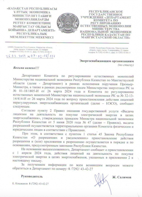энергоснабжения выдают территориальные органы комитета на основе правил оказания данной государственной услуги, в письме также даётся ссылка на пункт 1 статьи 45 закона «О разрешениях и уведомлениях». В нём написано всего одно предложение: «Приостановление действия разрешения и (или) приложения к разрешению осуществляется в порядке и по основаниям, предусмотренным законами Республики Казахстан».