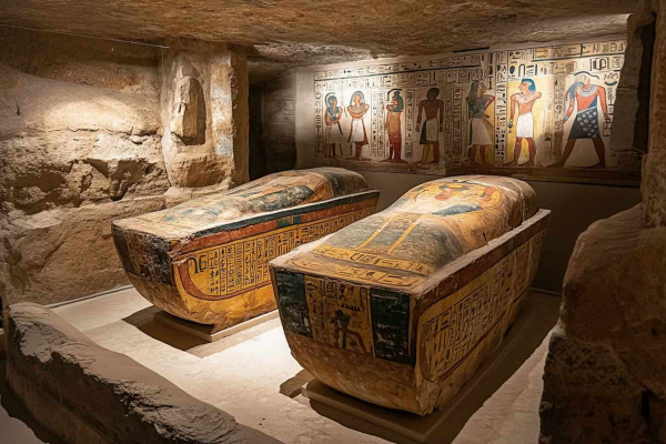 Он отметил, что в камере было два саркофага, полностью расписанные снаружи и изнутри текстами, которые рассказывают о «путешествии в загробный мир». В заявлении министерства сообщается, что археологи также обнаружили ритуальные сосуды и деревянные статуэтки.