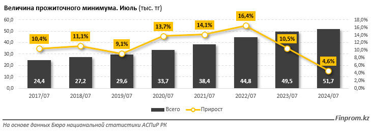 В июле текущего года прожиточный минимум в Казахстане составил 51,7 тысяч тенге — на 4,6% больше, чем годом ранее. Это невысокий рост в сравнении с предыдущими годами, сообщает finprom.kz.