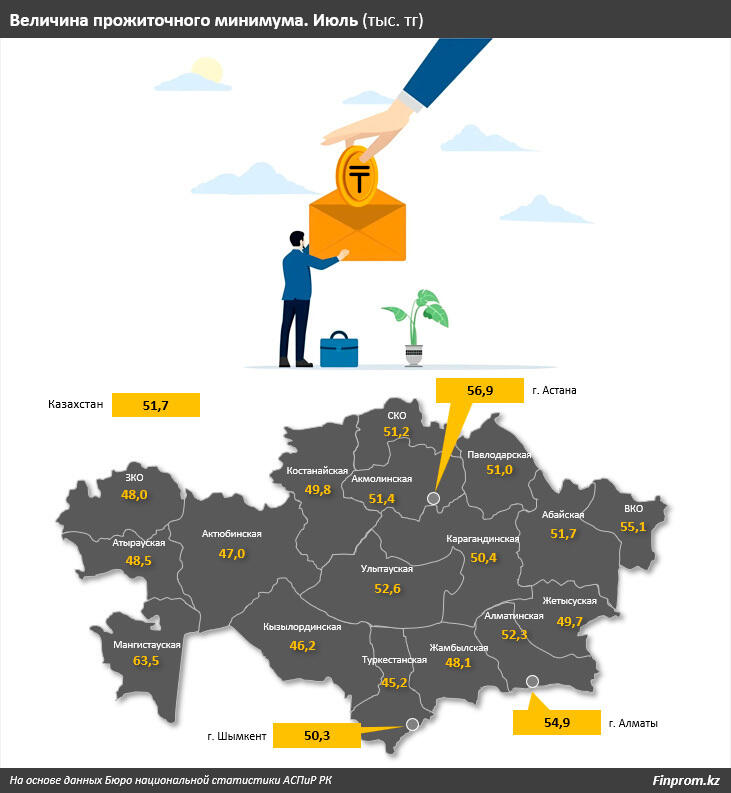 Наименьшая величина прожиточного минимума была отмечена в Туркестанской (45,2 тысяч тенге), Кызылординской (46,2 тысяч тенге) и Актюбинской (47 тысяч тенге) областях.
