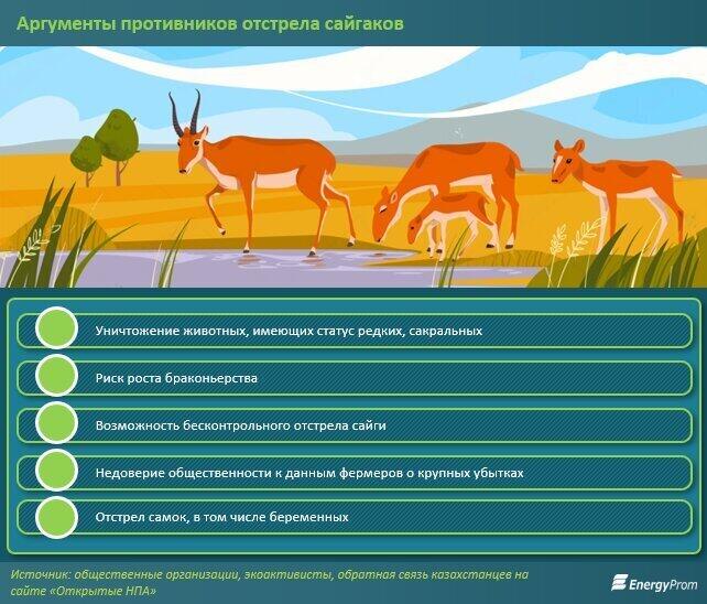Казахстанцы разделились на два лагеря. В одном из них те, кто поддерживает позицию властей и согласен с тем, что сайги стали слишком много и она действительно наносит серьёзный урон сельскому хозяйству. По предварительным данным, ущерб от потравы пастбищ сайгаками в Западном Казахстане уже превысил 12 млрд тенге. На другой стороне экоактивисты, общественники, которые призывают называть вещи своими именами и вместо терминов "изъятие" и "регулирование численности" говорить "убийство редких диких животных, чьи территории человек стал занимать под сельхозугодья". Противники программы считают, что после промыслового изъятия разрешат спортивную охоту, и тогда начнётся неконтролируемый отстрел сайги", — говорится в статье.